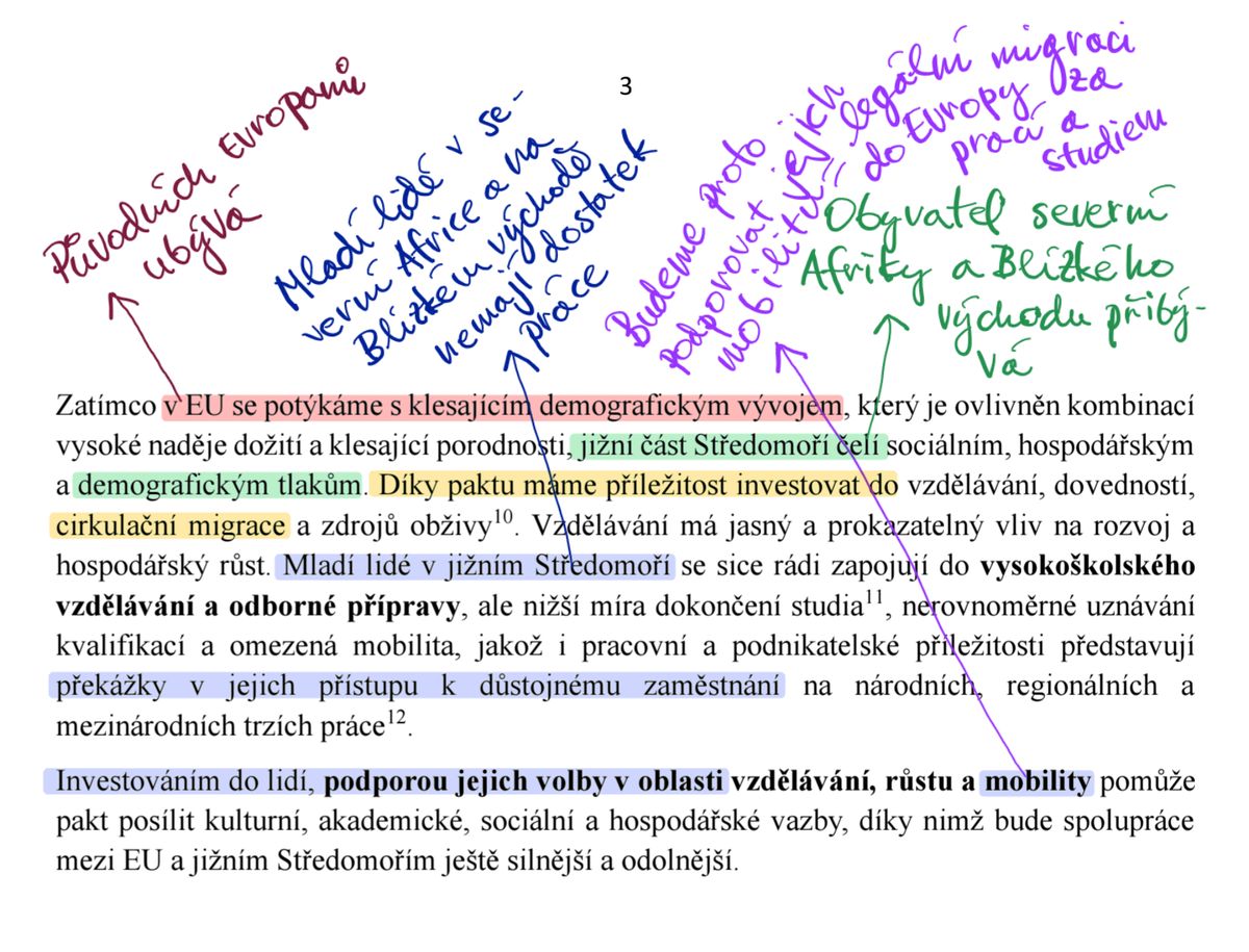 - Zeleně zvýrazněný text doplňuje, že obyvatel severní Afriky a Blízkého východu naopak přibývá. Fialový text naznačuje, že v těchto oblastech je hodně mladých lidí, čemž pravidelně mluvili úředníci Evropské komise při jednáních o obsahu Paktu.