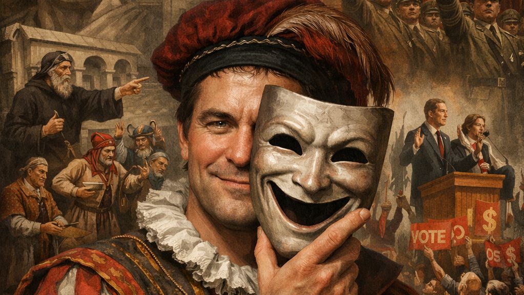 A právě zde se objevuje konstanta, která se vine staletími: herec jako služka moci. Vždy závislý na tom, kdo platí scénu, honorář a potlesk. Vždy připraven přizpůsobit se zadání. Není to otázka individuální morálky, ale struktury profese. Kdo je vycvičen mluvit cizími slovy, snadno přijme slova kohokoli, kdo zaplatí. Kdo se naučil emoci vyrábět, snadno ji vyrobí i pro ideologii.