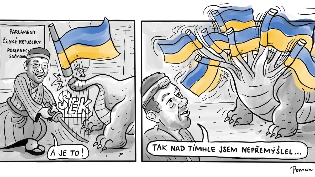 Tomiovy trampoty s ukrajinskou vlajkou na budově Poslanecké sněmovny