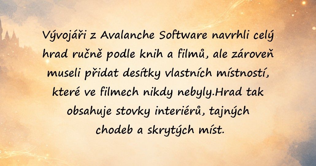 Pocit po vystoupení do nejvyšší věže je okouzlující. A navíc, odshora až dolů, jsou všechny chodby a kouty hradu propleteny spoustou hádanek. Tady si vývojáři pohráli s mnoha detaily. Během hraní strávíte v Bradavicích hromadu času, takže je dobře, že tato velkolepá stavba nepůsobí odfláknutě. I po mnoha hodinách budete objevovat nová a nová zákoutí.