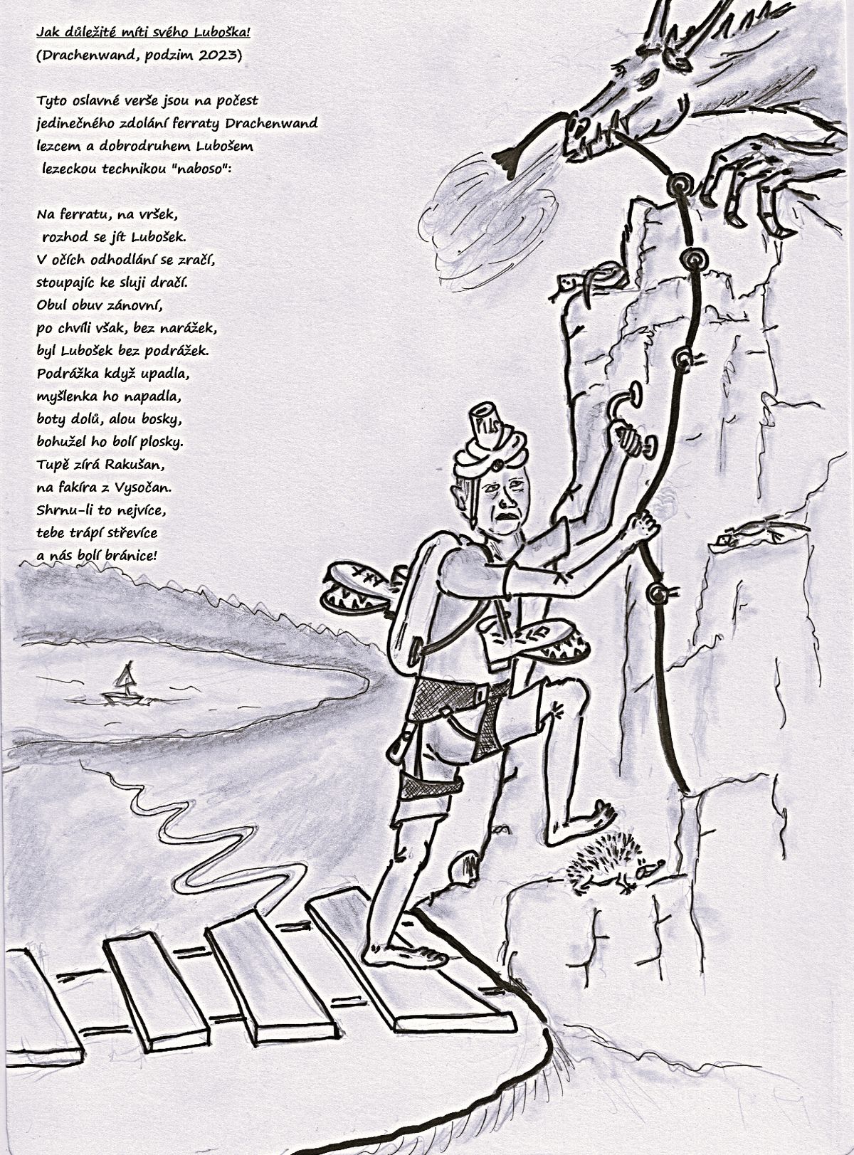 Vraťme se ale na začátek příběhu, kdy Lubošek je již obut v pohorkách zánovních a nastupuje do ferraty. A po pěti minutách výstupu to přišlo – Luboškovi upadla pravá podrážka. Nevydržela desetiletí skladování po pražských botnících a odlepila se, potvora. Je třeba říci, že Luboš není žádná měkota a rozhodl se nejspíše intuitivně i s ohledem na nás ostatní a naše budoucí zážitky pokračovat ve výstupu. Nevím, zda všichni, zejména mladší ročníky ví, jak vypadaly staré kožené pohorky a hlavně co je pod podrážkou. V tomto konkrétním případě pod poletující podrážkou se nacházela plastová botička. No a pokud lezete po železem zajištěné skále s plastovou botičkou, tak je zřejmé, že vám to bude připomínat kozu na ledě. Koza na ledě si ovšem kopýtka sundat nemůže, Luboš si však kopýtko zul a šel s jednou nohou bosou. Zatím výstup probíhal s úsměvy a vtipnými poznámkami, ale všichni tak nějak tušili, že to přece nemůže být konec tohoto příběhu. A nebyl. Lezení s jednou botou obutou a druhou bosou je nejen náročnější na techniku, je hlavně pomalejší. Po chvíli nás začali dolézat osmahlí chlapci z Rakous. Obzvláště jeden výkonnostně zaměřený jedinec se pod nás zavěsil, jeho oči byly nedočkavé a úporně čekal na možnost nás oblézt. Za tohoto stavu, kdy jsme byli seřazeni na skále jako miminka na Žižkovské věži, přišla další velká Lubošova chvíle – upadla mu levá podrážka a letěla dolů. Slovo „upadla a letěla“ je však třeba dovysvětlit, protože ta podrážka letěla dolů houpavě ze strany na stranu vzduchem jak orlí pero či javorové semeno. Ten Rakušák, co neustále sledoval, kde nás předběhnout, nemohl uvěřit tomu, co vidí. Myslím, že byl scénkou naprosto hypnotizován, protože jinak si není možno vysvětlit, že se nechal padající podrážkou kompletně profackovat jak neposlušný školák při sledování nudného ruského filmu o obléhání Leningradu. Při pohledu na tu potupu jsme nakonec nechali rudolícího Rakušáka předběhnout naší skupinu a snad definitivně urovnali rakousko – české spory. Pro Luboše se však situace stávala kritickou. Musel již úplně naboso a k pohodě to u něj moc nepřispělo. Jak jsem však upozornil výše, Lubošek není žádný změkčilec a dosáhl vrcholu sice v horším čase , ale s výrazem fakíra chodícího dvě hodiny po žhavých hřebících. To netušil, že ještě nemá vyhráno, protože cesta z vrcholu dolů do údolí je prudká, kamenitá a často po železných schodech. To vše musel Lubošek zdolat ve svém zánovním obutí s plastovou botičkou. Jeho pohyb dolů po pěšině je možno přirovnat k bláznivým kresleným filmům pro děti, kdy hrdina sjíždí na prkně svah jakési sopky, aby unikl za ním se valící horké lávě. Zajímavé (pro pozorné čtenáře však nepřekvapivé) bylo, že opět většina kamarádů šla až za Luboškem a sledovala zpovzdálí jeho boj se živlem. Všichni si chtěli uložit tyto vzácné chvíle do své paměti. Myslím, že se nám to všem podařilo mírou vrchovatou.