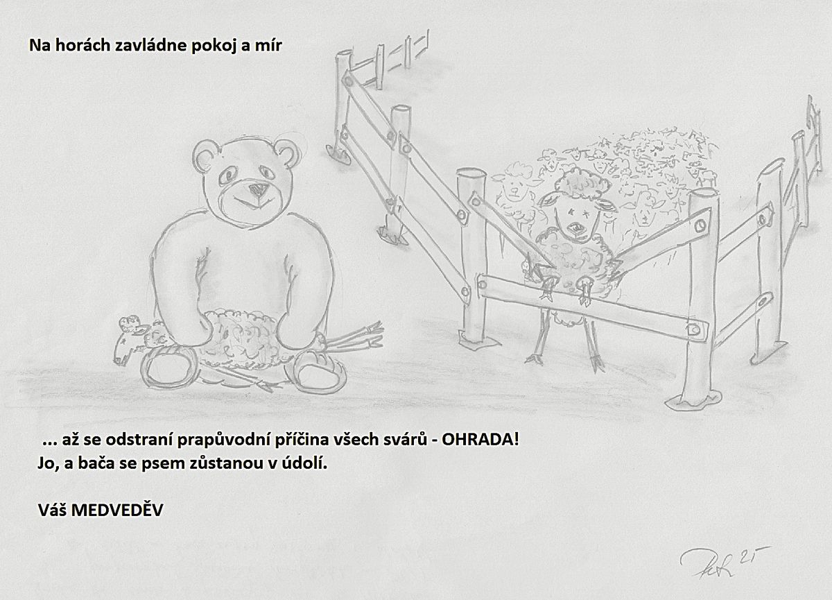 Na horách bude klid a mír … až se odstraní prapůvodní příčina všech svárů - OHRADA! Jo, a bača se psem zůstanou v údolí. Váš MEDVEDĚV