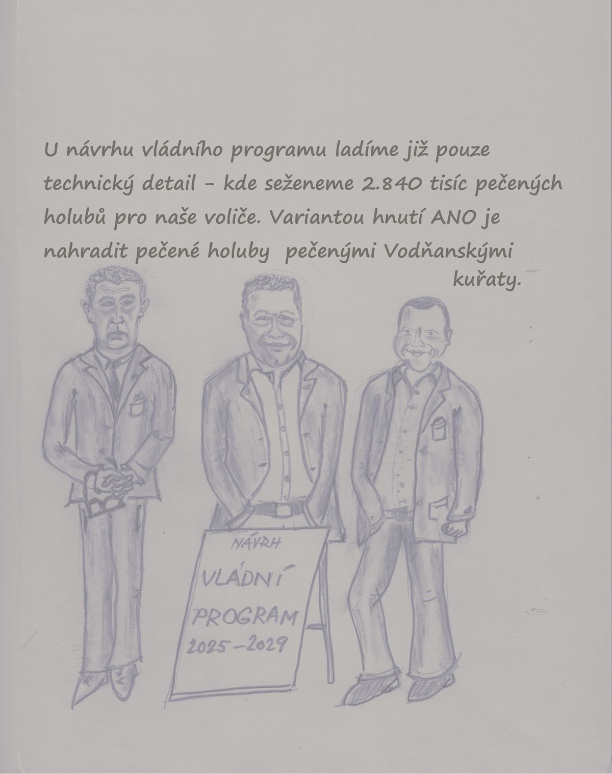 U návrhu vládního programu ladíme již pouze technický detail, kde seženeme 2.840 tisíc pečených holubů pro naše voliče. Variantou hnutí ANO je nahradit pečené holuby pečenými Vodňanskými kuřaty.