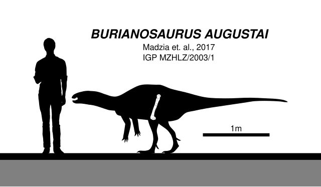 jediný dosud oficiálně uznaný druh neptačího dinosaura, který byl nalezen na území České republiky. Tento býložravý ornitopod žil přibližně před 94 miliony let v období svrchní křídy. A i když patřil spíše k menším dinosaurům, úplný drobek to nebyl (dle odhadů mohl dosahovat délky až 4 metry a váhy do 300kg!). Jeho pozůstatky byly objeveny v lomu u Mezholez poblíž Kutné Hory. V době, kdy Burianosaurus žil, bylo naše území z velké části pokryto mělkým mořem a rozptýlenými ostrůvky, takže z logiky vyplývá, že pro dinosaury jsme tu v těch dobách příliš prostoru neměli. Konkrétně z něj byla nalezena stehenní kost, která se stala symbolem české druhohorní fauny.