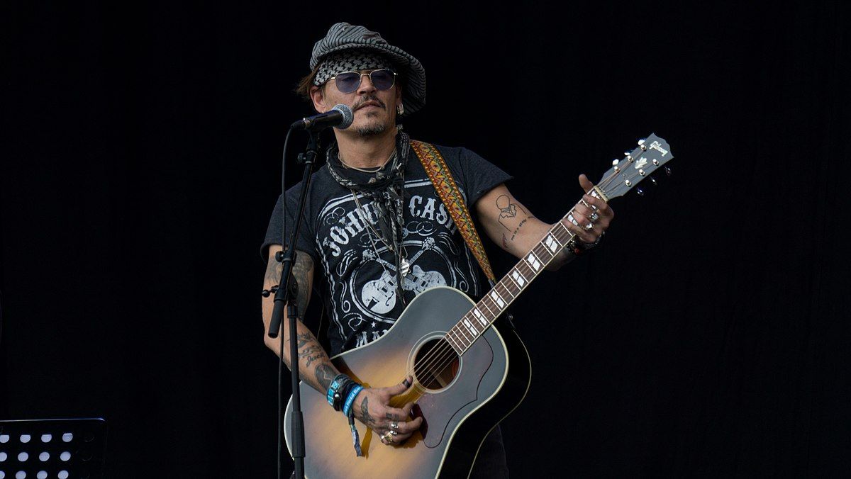 Johnny Depp hraje na kytaru v kapele Hollywood Vampires, kde kromě něj září i Alice Cooper.