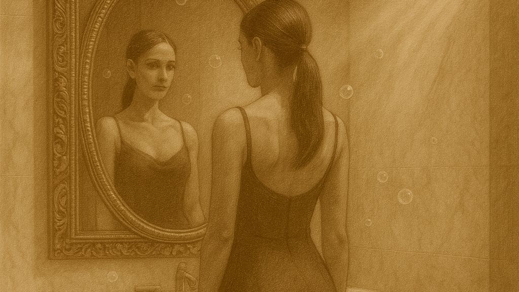Opře se o mramor jen dlaněmi, nohy má u sebe, jako by chtěla ukázat, že i v těsné linii může být nekonečno. Já ten obraz udržím bez doteku: povel beze slov. „Ještě půl paty dozadu. Zastav se na hraně dlaždice. Dýchej jako když se voda v karafě dotkne okraje.“ V zrcadle vidím, jak váha přejde z jedné jehly na druhou; šaty spolupracují bez odporu. Není nic k vidění—je jen vědění. To hoří líp než světlo.