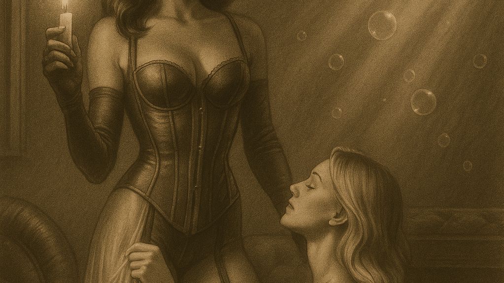 Nakloní se, čelo opře o moje. „Pak jsi zkoušku splnila.“ Svíčka konečně zhasne — ne výdechem, ale prsty, které ji přinutí. V místnosti zůstane moje poslušnost; bublinka v číši dohraje poslední tón. Položí mi dlaně na zátylek a přitáhne mě. Polibek není odměna; je to pečeť.