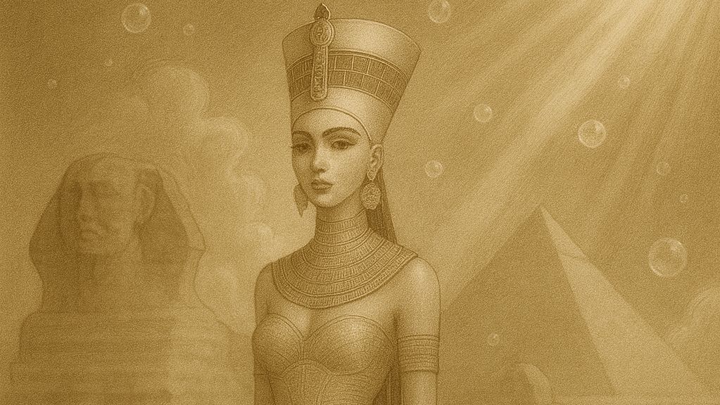 Královna mě vede k nízkému stolku se zrcadlem. Postaví mě tak, abychom v odraze byly obě. Stojí za mnou, dlaně na mých bocích. V zrcadle vidím, jak se její pohled rozsvítí, když zvednu bradu jen o kousek. Dovolí mi, abych sama rozepnula poslední háček závoje. Tkanina sklouzne a zastaví se na hraně, která více slibuje, než ukazuje. Je to hra přesnosti. Otočím se k ní. Zvednu ruku s otiskem skarabea a přiložím ji na její zápěstí; ona na oplátku přiloží svůj znak na mou šíji, k místu, které skrývá vlasy. Dva otisky, dvě cesty, které se kříží právě tam, kde roste touha.