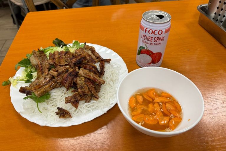 V podniku Dung Lien ji servírují s rýžovými nudlemi, čerstvými bylinkami a omáčkou, která vyvažuje sladké, slané i kyselé chutě. Kombinace masa a velkého množství bylinek působí překvapivě lehce a vyváženě.