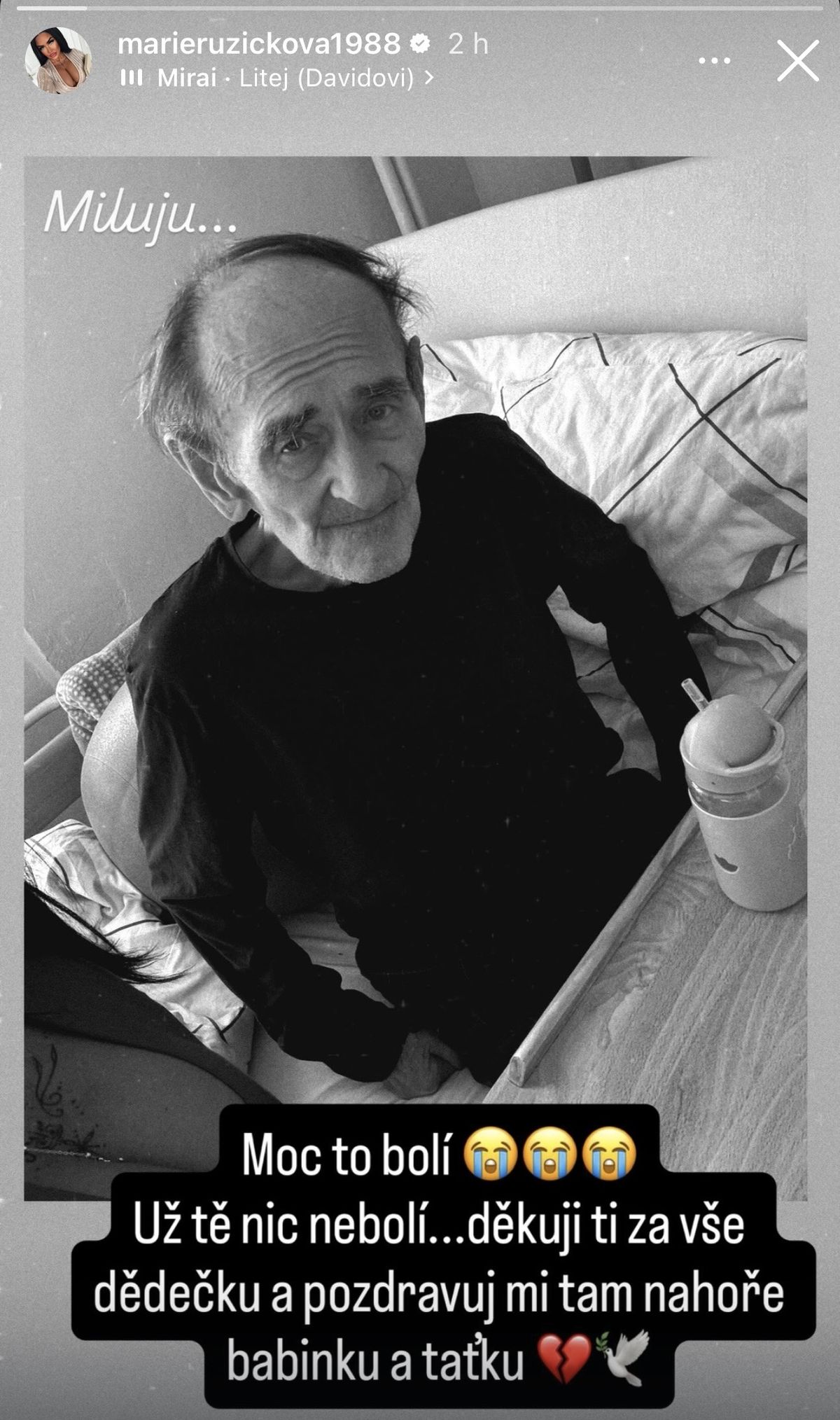 Jak se následně svým sledujícím na instagramu svěřila, její dědeček trpěl Alzheimerovou chorobou. „Člověk má takový svůj svět. A má bohužel dobré dny a špatné dny. Děda měl dneska ten horší, ze včerejška na dnešek jim tam docela dost zlobil,“ popsala před časem Růžičková, která se nyní musí vyrovnat se skutečností, že její dědeček odešel na věčnost.
