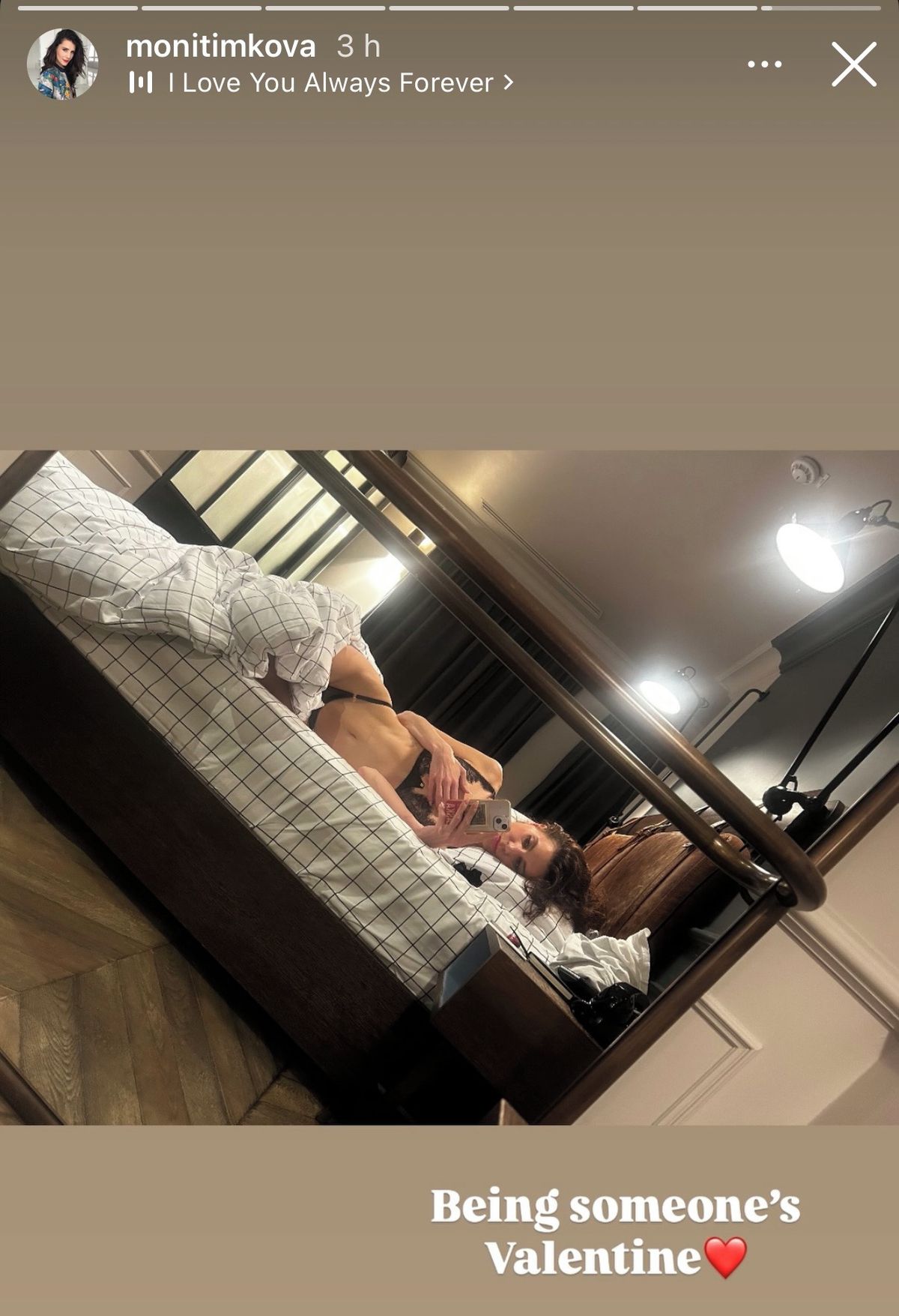Poté přidala stories z letadla a následně výhled na hotelovou postel, kde byla obrovská kytice. V ruce navíc držela čokoládové srdíčko zabalené v červeném alobalu. Poté ještě přidala z postele svůdný snímek v černém spodním prádle. K této fotografii přidala anglický text, z něhož je patrné, že Valentýna tráví ve dvou v romantické Paříži.