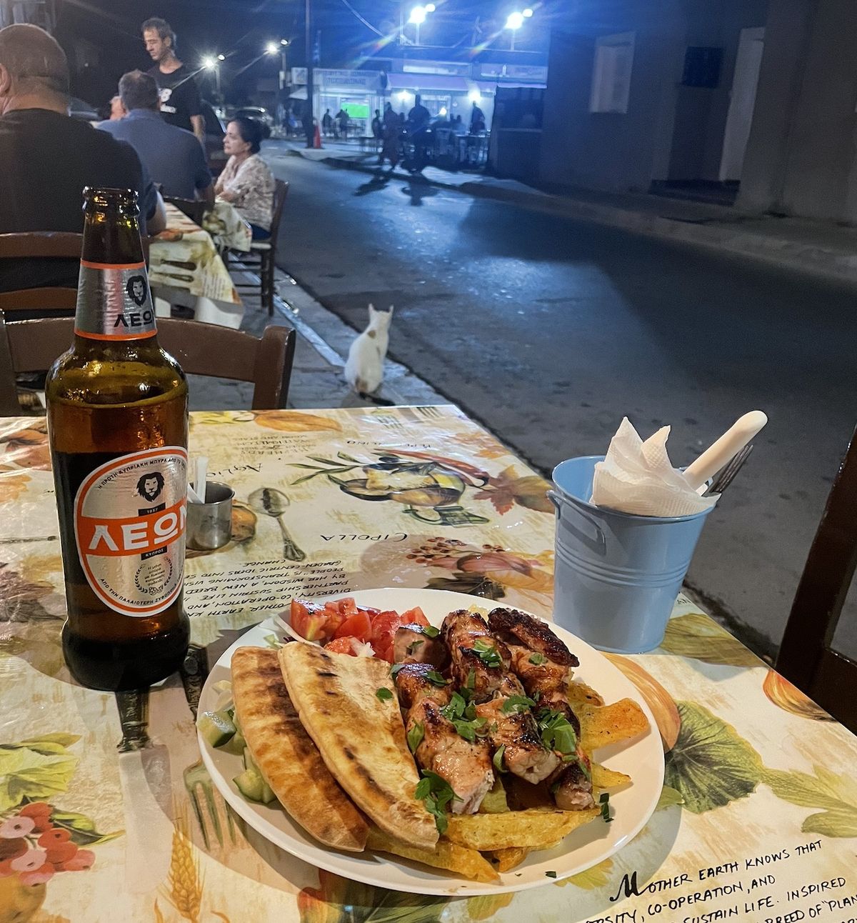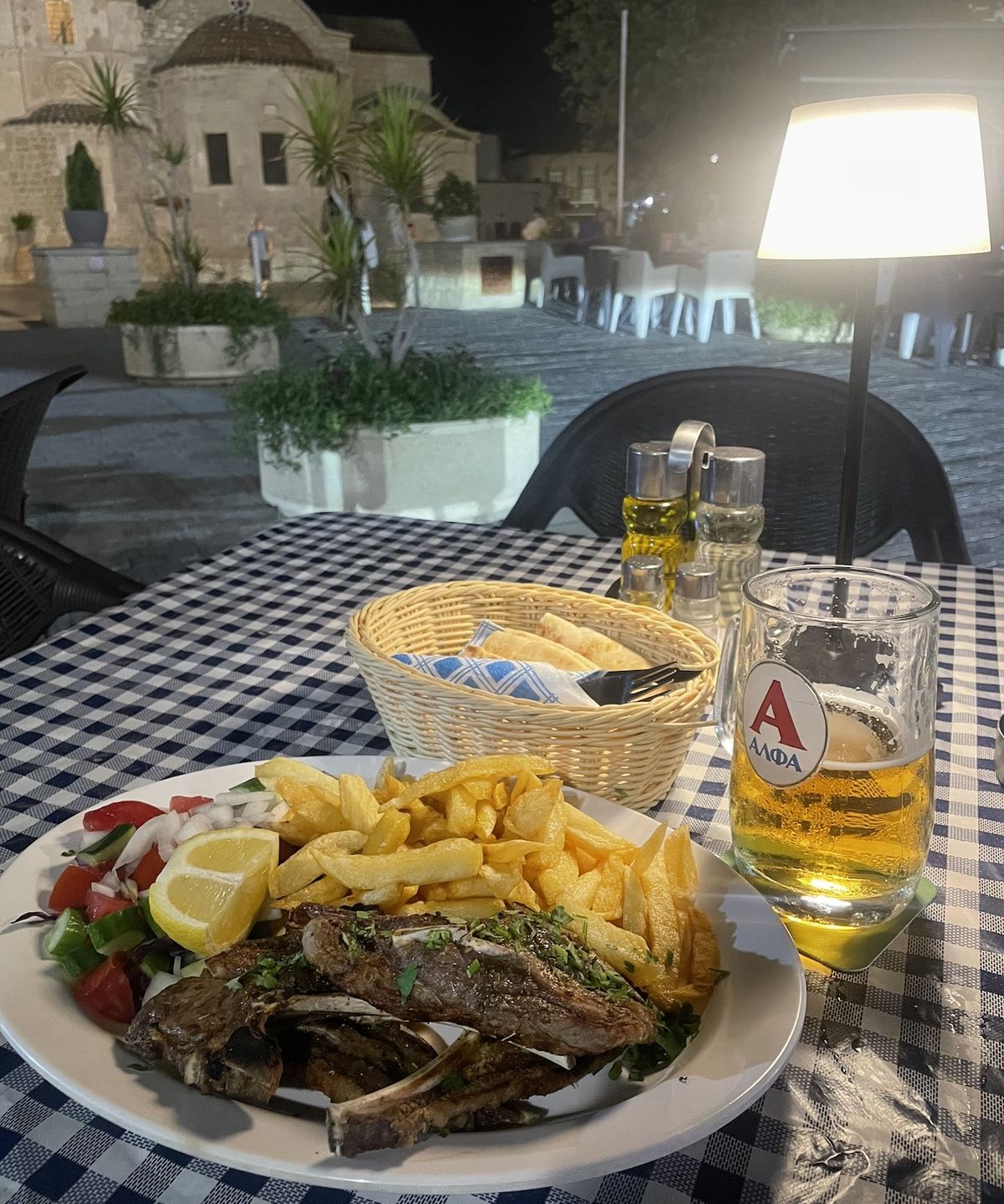 Jehněčí kotletky, točené pivko a výhled na kostel. Do restaurace Stoa se vracím vždycky když jsem na Kypru.