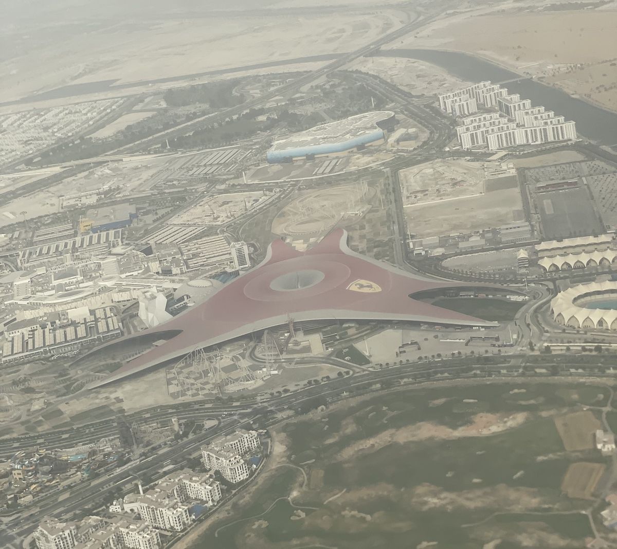 Ferrari World jsem si stihl vyfotit jen na rozloučenou z letadla - i z nebe působí monumentálně.