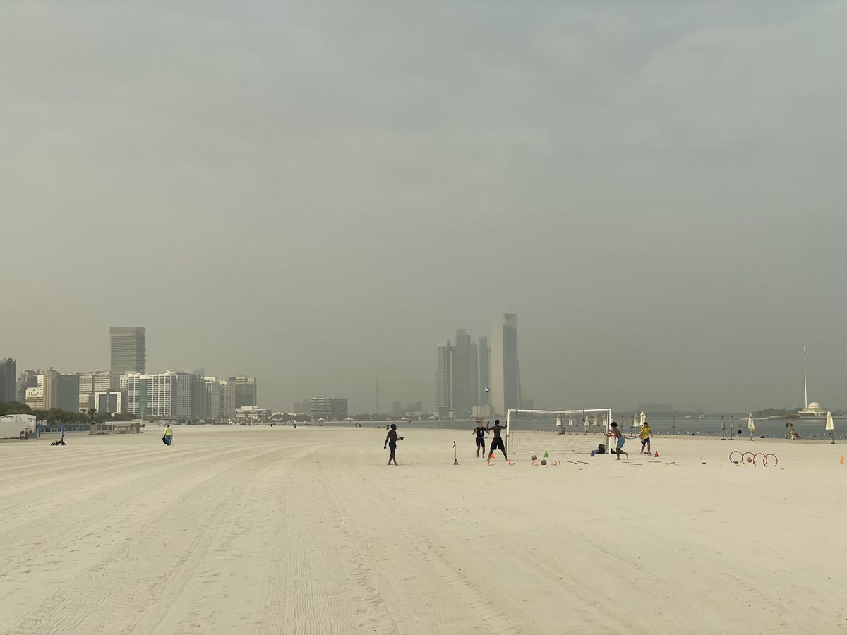 Fotbalový trénink na pláži. Sportovat v letních měsících je tady možné jedině brzy ráno, dokud nevyjde spalující slunce nad obzor.