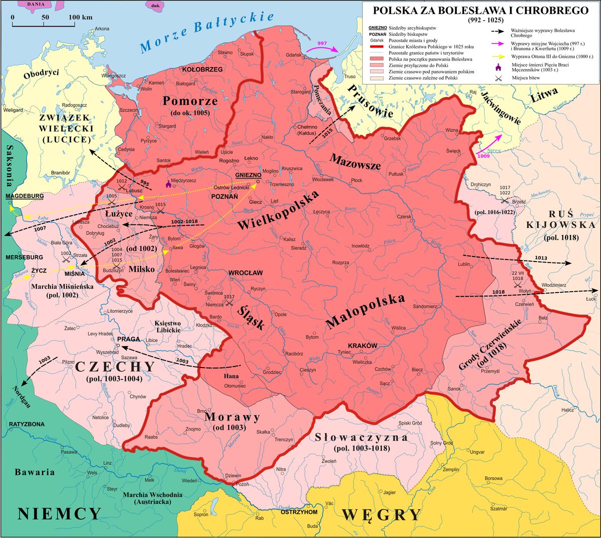 Mapa polského státu v době vlády Boleslava Chrabrého.