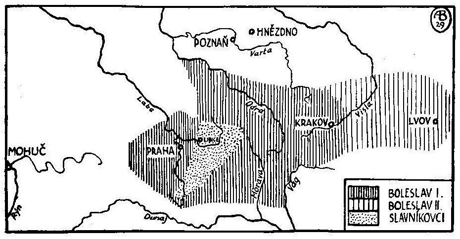 Mapa rozsahu českého státu v 10. století za vlády Boleslava I. a Boleslava II.