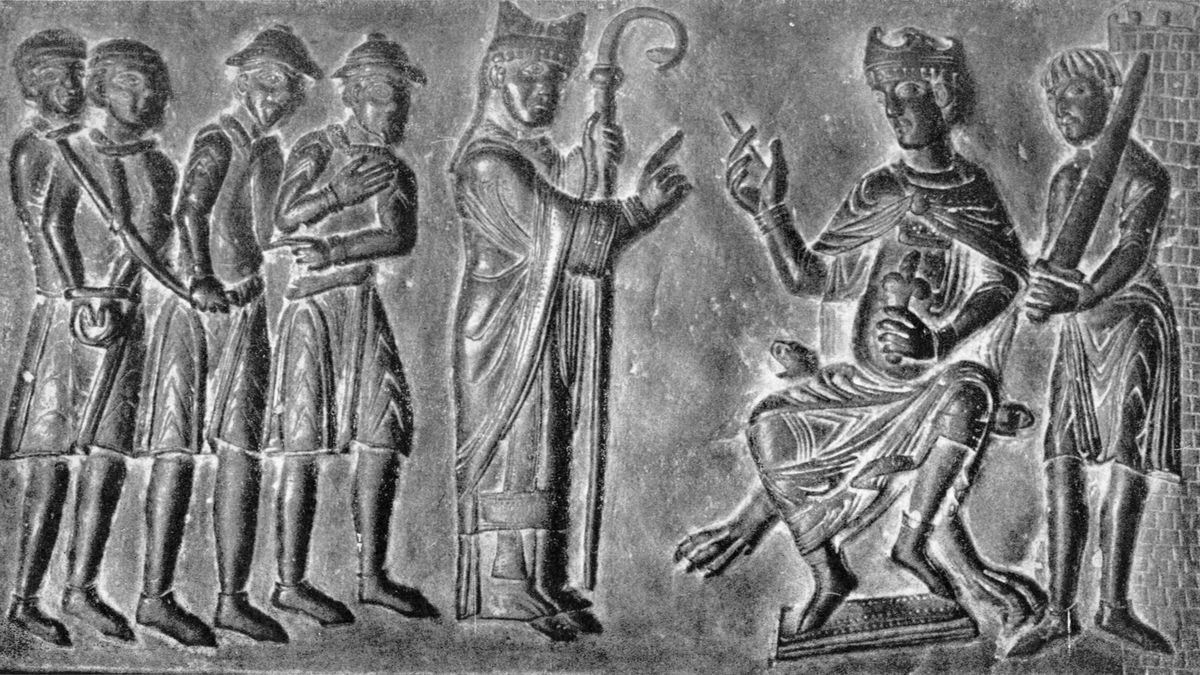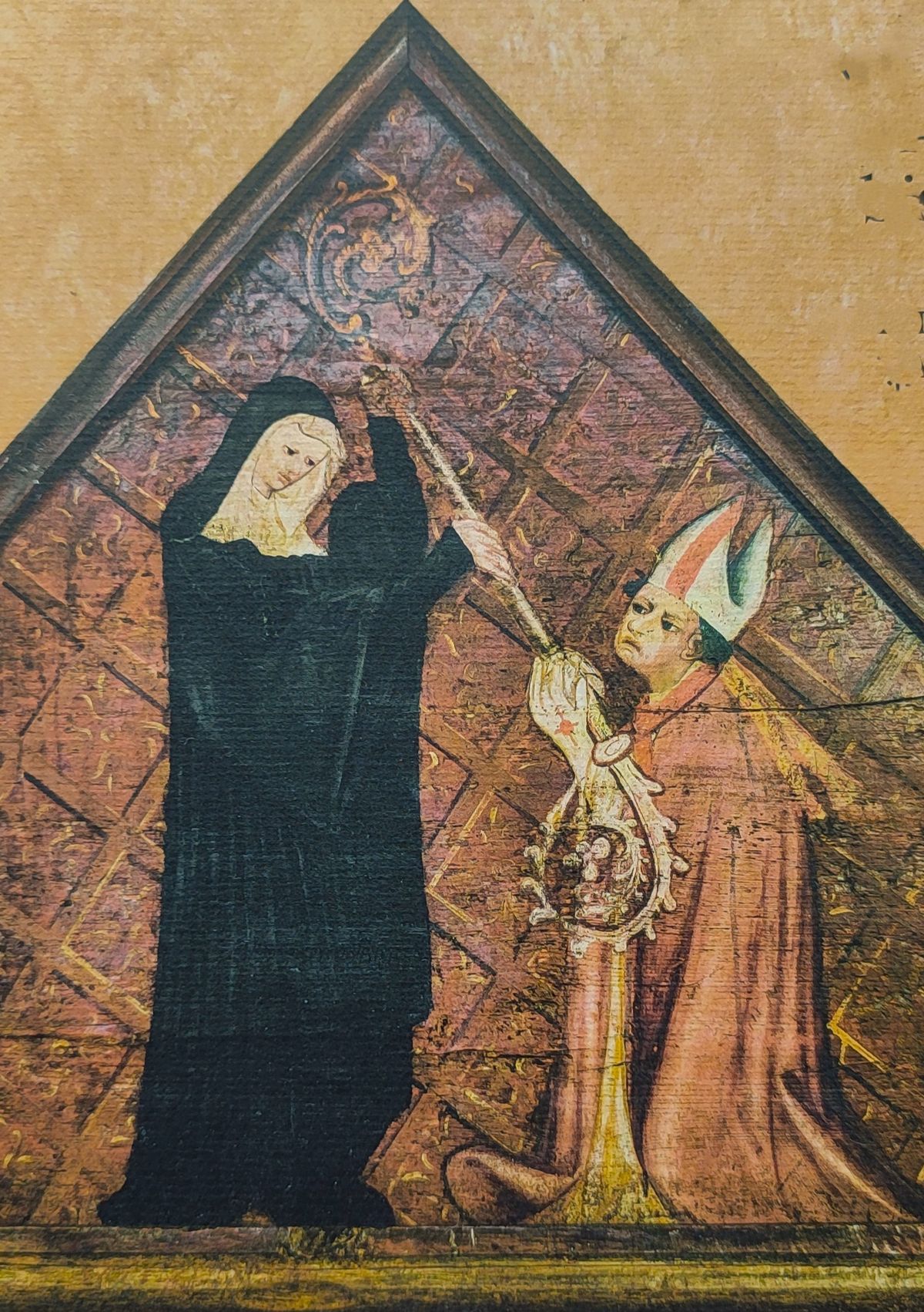 První svatojiřská abatyše, Přemyslovna Mlada předává berlu prvnímu pražskému biskupovi Dětmarovi, malba na sarkofágu krále Vratislava I. v kostele sv. Jiří na Pražském hradě, kolem 1350