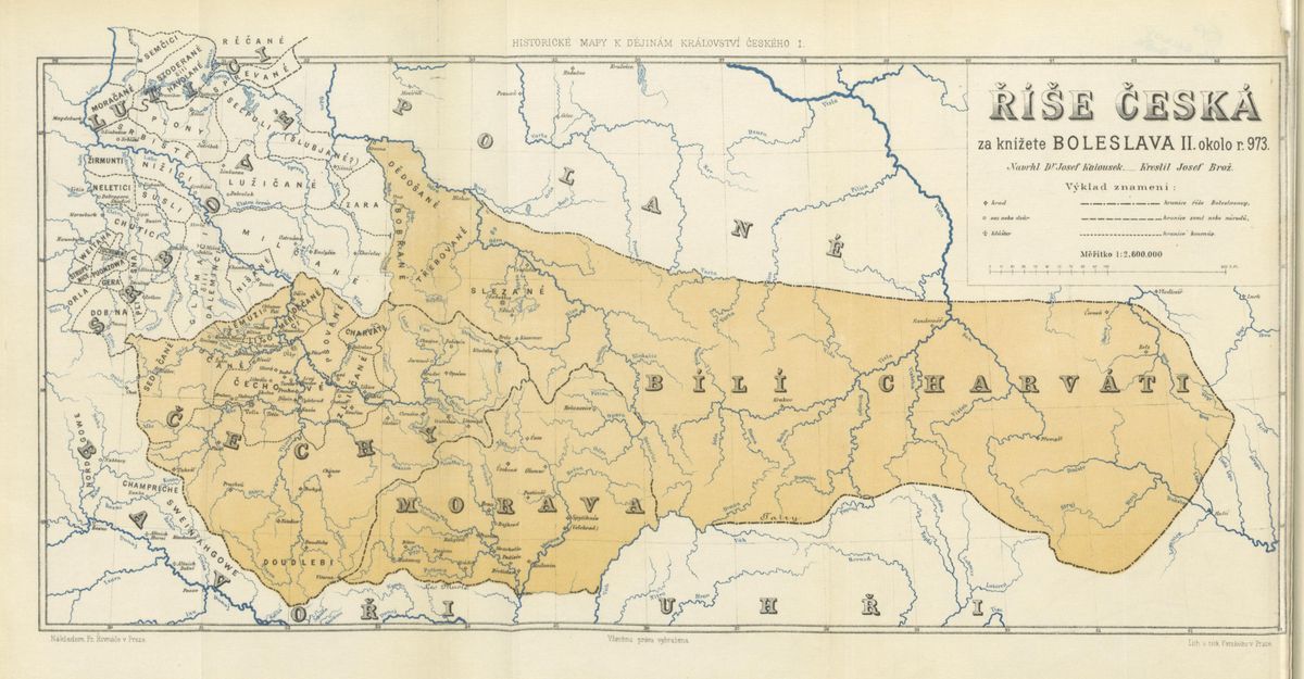 Mapa českého státu za Boleslava II. z knihy „Děje království českého“ od V. V. Tomka