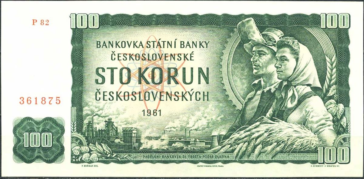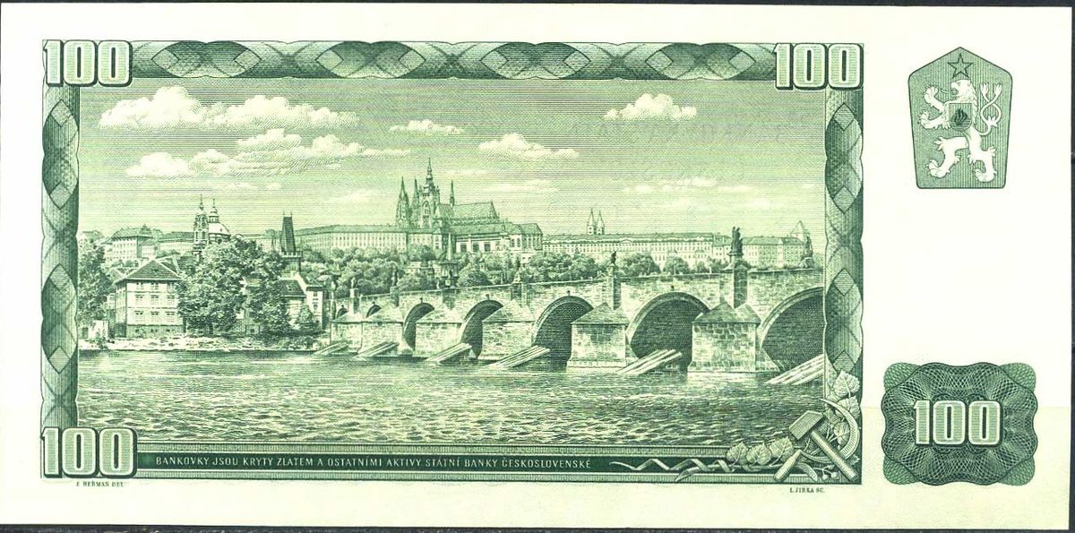 Asi nejznámější a podle některých znalců i nejkrásnější československou bankovkou byla zelená stokoruna, která se v oběhu udržela od prosince roku 1962 až do února roku 1993, tedy více než třicet let. Na rubu se objevily Hradčany, na lícní straně slévač a rolnice se snopem obilí. Zajímavé je, že bankovku nenakreslil profesionální výtvarník, ale podplukovník Československé lidové armády František Heřman, jehož návrh vyhrál v soutěži. Modelkou mu prý stála manželka.