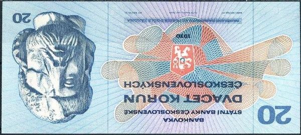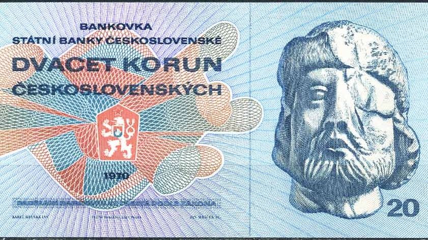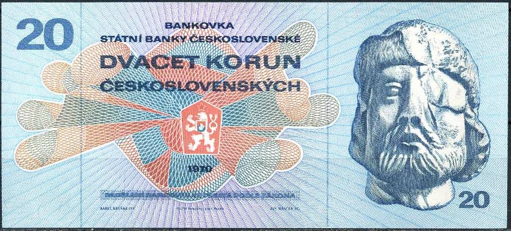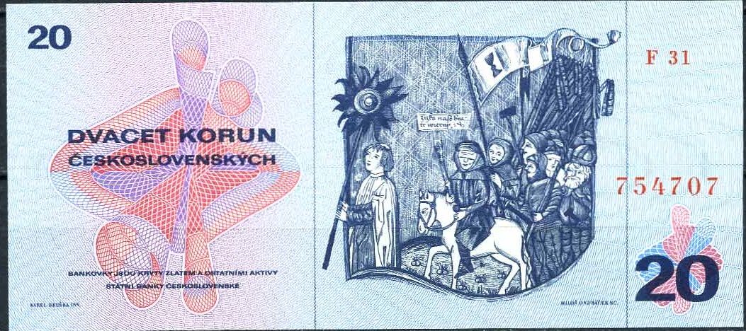 A nyní se dostáváme k modré dvacetikoruně grafika Karla Hrušky s Janem Žižkou na lícní straně. Byla vydána do oběhu v dubnu 1971. Nahradila pětadvacetikorunovou bankovku Karla Svolinského a platilo se s ní až do června 1991.