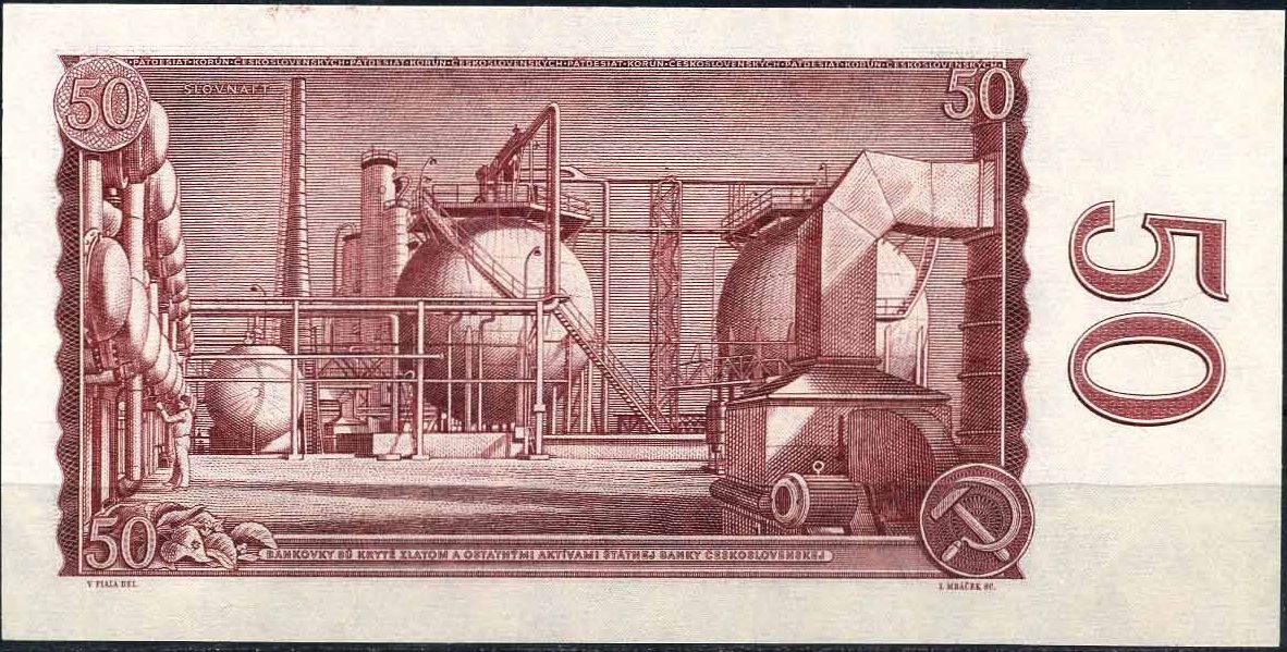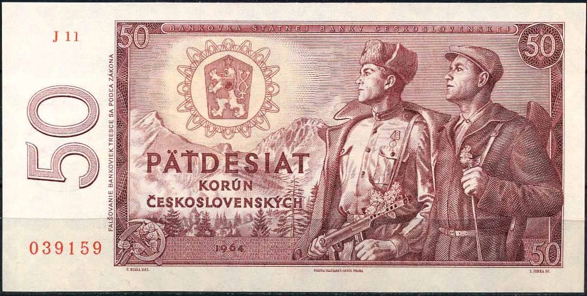 Další bankovkou danou do oběhu byla červená padesátikoruna Václava Fialy, která platila od dubna 1965 až do června 1991. Tato bankovka byla vybrána až na třetí pokus. První návrh Karla Svolinského se vůbec nerealizoval. Následně byl vybrán pro tvorbu bankovky Václav Fiala, který ale napoprvé také neuspěl. Realizoval se až jeho druhý návrh se sovětským vojákem a slovenským partyzánem na lícní straně a bratislavskou rafinerií Slovnaft na rubu. V jeho první verzi uvedené postavy vojáka a partyzána vypadaly odlišně a na rubové straně byly místo Slovnaftu Švermovy závody v Podbrezové nad Hronom.