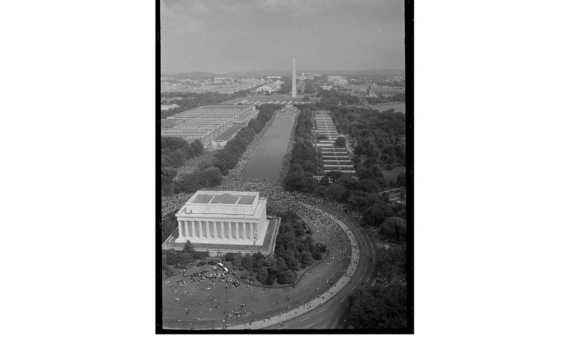 28. srpna 1963. Letecký pohled od Lincolnova památníku směrem k Washingtonovu monumentu