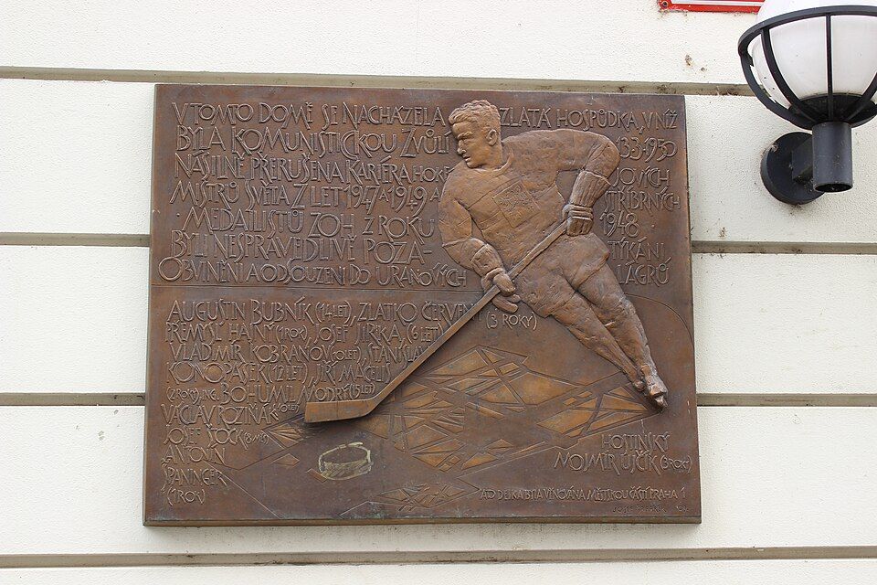 Pamětní tabule připomínající zatčení hokejistů 13. března 1950.
