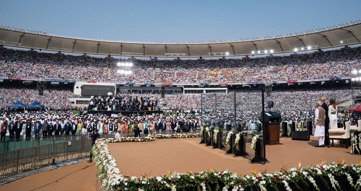 Trump v Indii v roce 2020 s indickým premiérem a jeho ženou. Na velkém stadionu, obestřen plotem