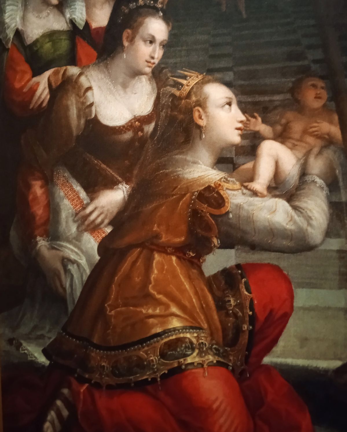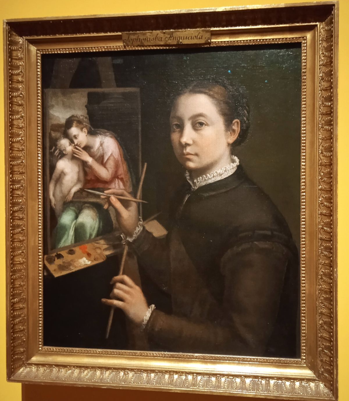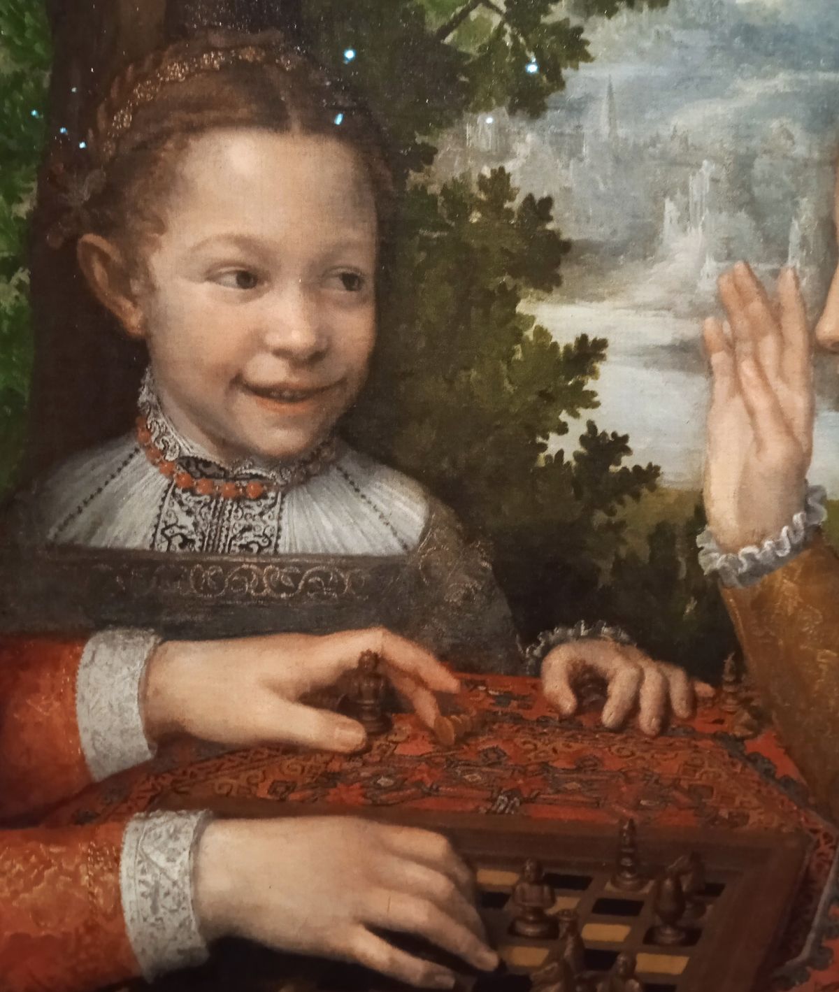 Každý návštěvník se docela jistě zastaví u šachové partie tří mladých dam - u promo díla celé výstavy - jímž je výpravné plátno Sofonisby Anguissoly Šachová hra z roku 1555. Na obraze jsou zachyceny tři dívky, dvě z nich právě dohrály šachovou partii. Nebo nedohrály? Čteme z tváří mladších sester malířky Sofonisby, čteme z tváře Lucie, Minervy a Europy, pozorujeme jejich gesta a oděvy, dívá se na ně také jejich chůva. A tvůrci výstavy nám připravili mimořádnou příležitost: zatímco u šachovnice vidíme malířčiny sestry - ji samu, malířku Sofonisbu Anguissolu spatříme jen o pár metrů dál, kde je pro diváky připraven její autoportrét tak, aby mohli bezprostředně pozorovat a konfrontovat obě díla. Prostřednictvím dvou obrazů jediné autorky je divák silněji vtažen do poněkud vzdálené minulosti, o malinko lépe může porozumět souvislostem, porovnává, poznává - obraz jako médium paměti přináší divákům nový význam, novou souvislost. To je skvělý instalační okamžik a takových má výstava víc.