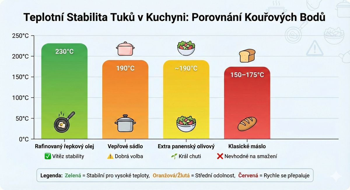- Rafinovaný řepkový olej: Kouřový bod je až 230 °C.