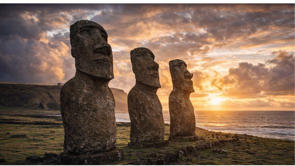 📌 Velikonoční ostrov – samota uprostřed oceánu a tváře kamenných Moai, které připomínají, že i izolace má paměť.