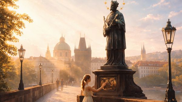 Socha Jana Nepomuckého stála pevně u zábradlí, s hvězdami kolem hlavy. Lidé se jí dotýkali s úctou, někteří jen ze zvědavosti. Říkalo se, že Jan byl muž, který raději snesl smrt, než aby zradil důvěru a právě proto se o něm začalo mluvit jako o svatém.