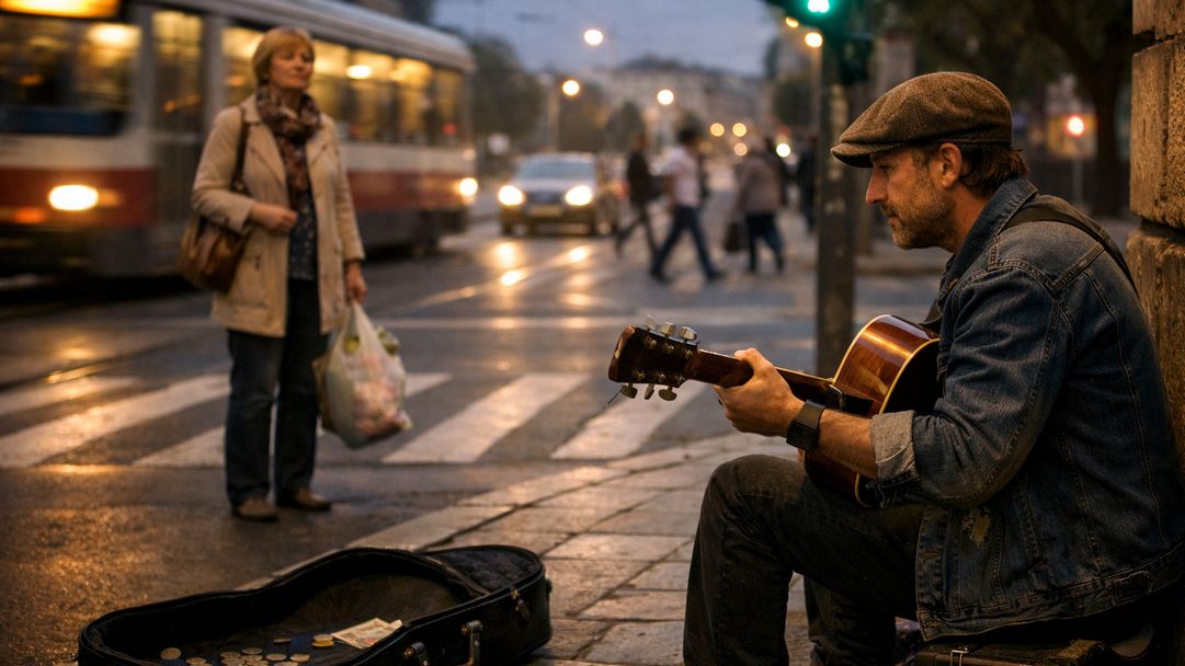 Na rohu ulice, kde se tramvaje otíraly o ticho podvečera, stál muž s kytarou. Neměl kolem sebe dav, jen otevřený futrál a pár mincí, které cinkly pokaždé, když kolem někdo zpomalil krok. Hrál spíš pro vzduch než pro lidi.