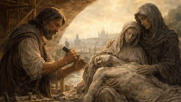 Na lešení u třetího pilíře stál sochař Jan Brokoff, ruce zkřehlé, prsty rozpraskané od vápna a chladu. Kámen před ním byl ještě bezejmenný, těžký blok pískovce, v němž se skrývala Matka s mrtvým Synem. On to věděl. Viděl ji už dávno, dřív než se dotkl dláta. Přicházela k němu ve snech, seděla mlčky, s hlavou skloněnou, a její náruč byla prázdná i plná zároveň.