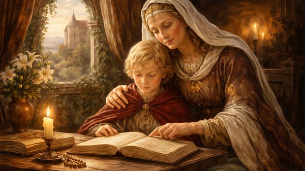 Učila ho číst nejen písmo, ale i lidské tváře. Učila ho, že vládnout znamená nést, ne poroučet. Že síla není udeřit první, ale obstát bez nenávisti. Slova mu vkládala do srdce a modlitby šeptala tak, aby je cítil, ne jen slyšel.