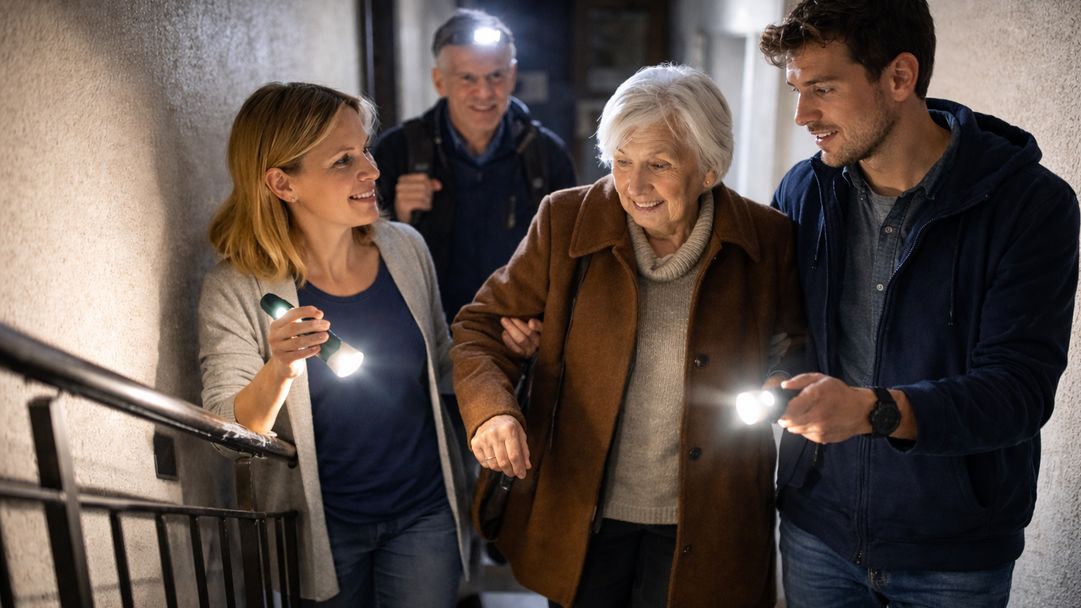 Z jednoho bytu vyšel mladík s baterkou v ruce. O chvíli později se na chodbě objevila sousedka z vedlejšího bytu s telefonem, který svítil jako malé světlo.