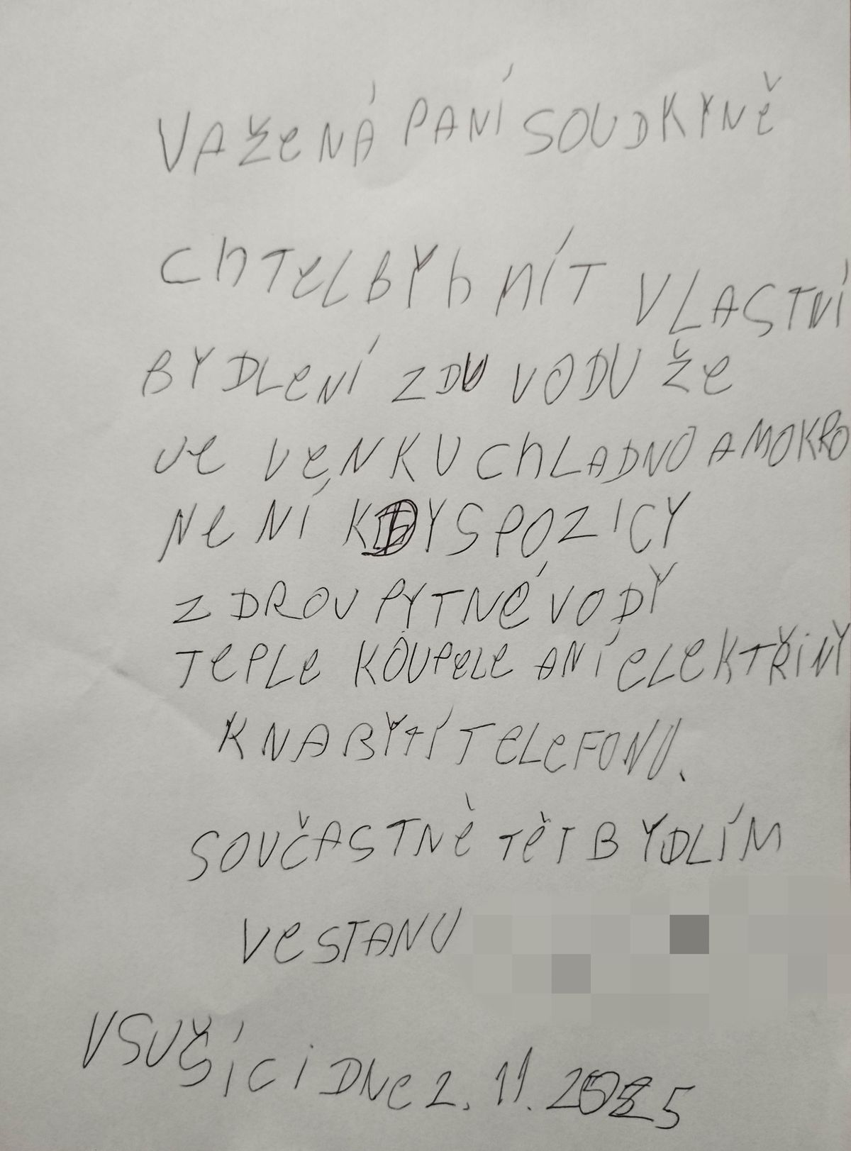 Jeho dopis soudkyni, psaný roztřesenou rukou, je výkřikem do tmy. Prosí o vlastní bydlení. Popisuje, že nemá přístup k pitné vodě, teplé koupeli ani elektřině. Nemá ani možnost nabít telefon. A přesto – žádná reakce. Žádná pomoc. Žádná odpovědnost.
