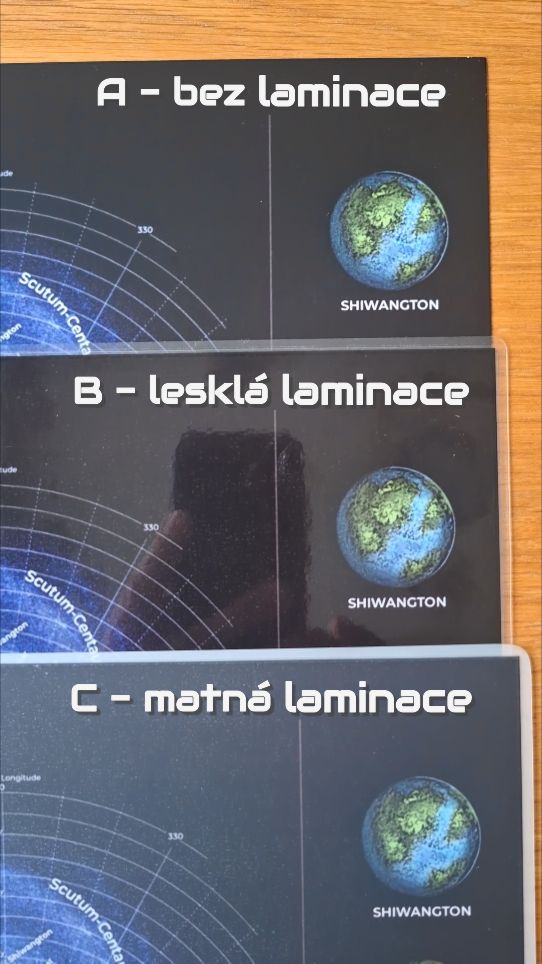- Matná laminace – minimum odlesků, elegantní, snadno čitelná i pod lampou.