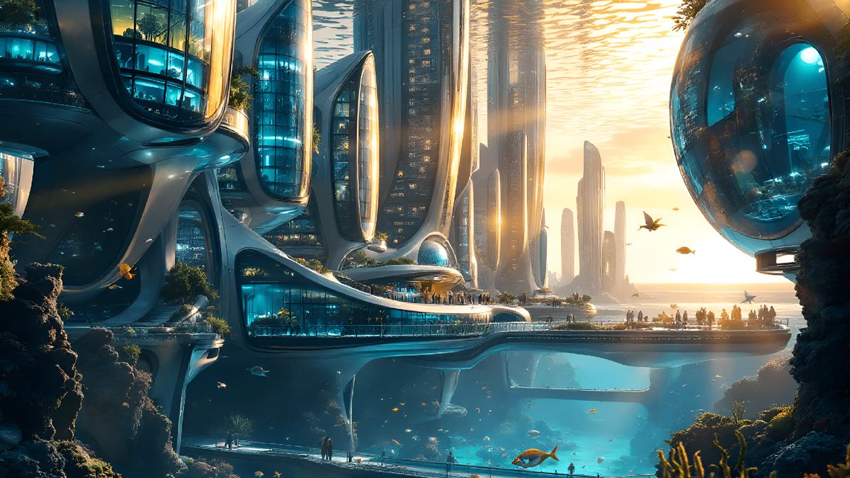 Nad hladinou se táhnou mosty jako tenké harfy napnuté přes průlivy, přístavní terasy sbírají energii z větru a příboje a střešní zahrady filtrují slanou mlhu do pitné vody. Pod hladinou se rozprostírají kupole propojené tunely, tržnice v dutinách korálových struktur a tiché náměstí kolem sloupů z živých řas, které ve vlnách žhnou jako hvězdné mapy. Města jsou synchronizovaná s přílivy: když se moře zvedá, otevírají se ventily a proudění žene vodní farmy; když ustupuje, ožívají suchozemské promenády.