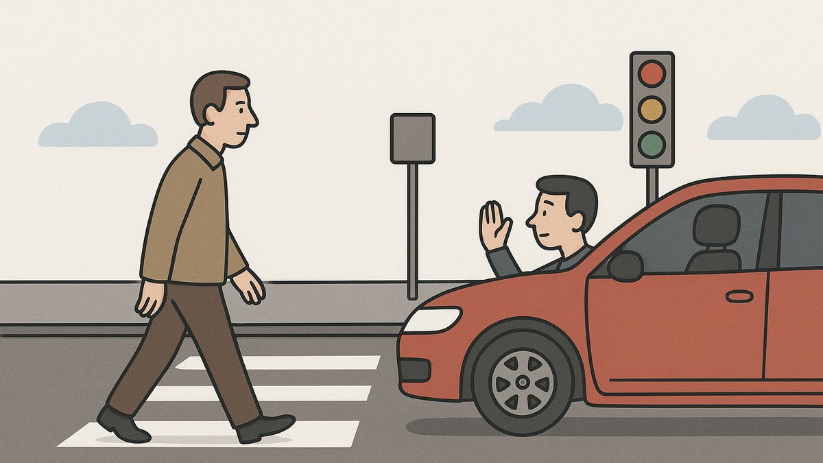 U přechodu se potkává síla těžkého stroje s lidskou zranitelností. Tím spíše by mělo docházet k oboustrannému respektu k drobným gestům, která nic nestojí a připomínají vzájemné povědomí jednoho o druhém.