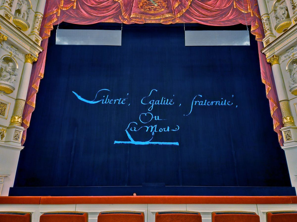 Dialogy karmelitek, Semperova opera, Drážďany, 23. 2. 2026. Diváci jsou přivítáni revolučním heslem „Liberté, Égalité, Fraternité ou la mort“ – Svoboda, rovnost, bratrství nebo smrt. Radikální francouzské revoluční heslo se objevilo kolem roku 1793. Po pádu Robespierra v roce 1794 byla část „la mort“ rychle opuštěna a zůstala triáda Liberté, Égalité, Fraternité, která je dnes oficiálním mottem Francouzské republiky. Příběh opery se zakládá na skutečných událostech z roku 1794, kdy byly karmelitky z kláštera v Compiègne popraveny. Děj opery Dialogy karmelitek je však zasazen do roku 1789.