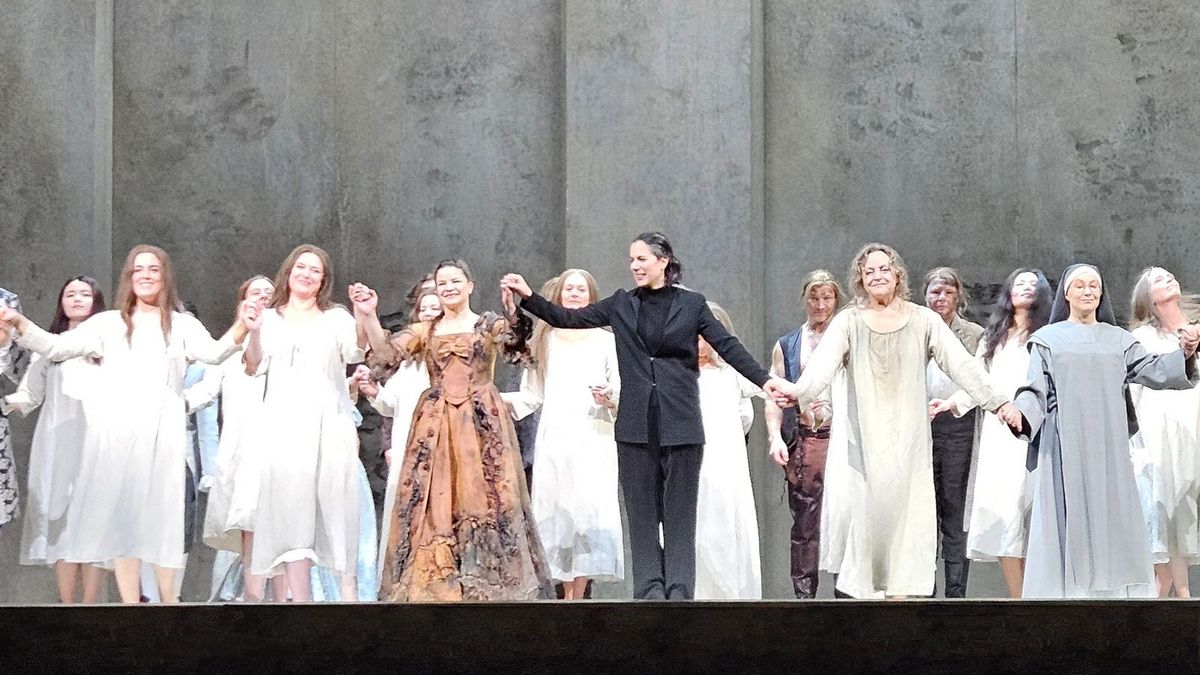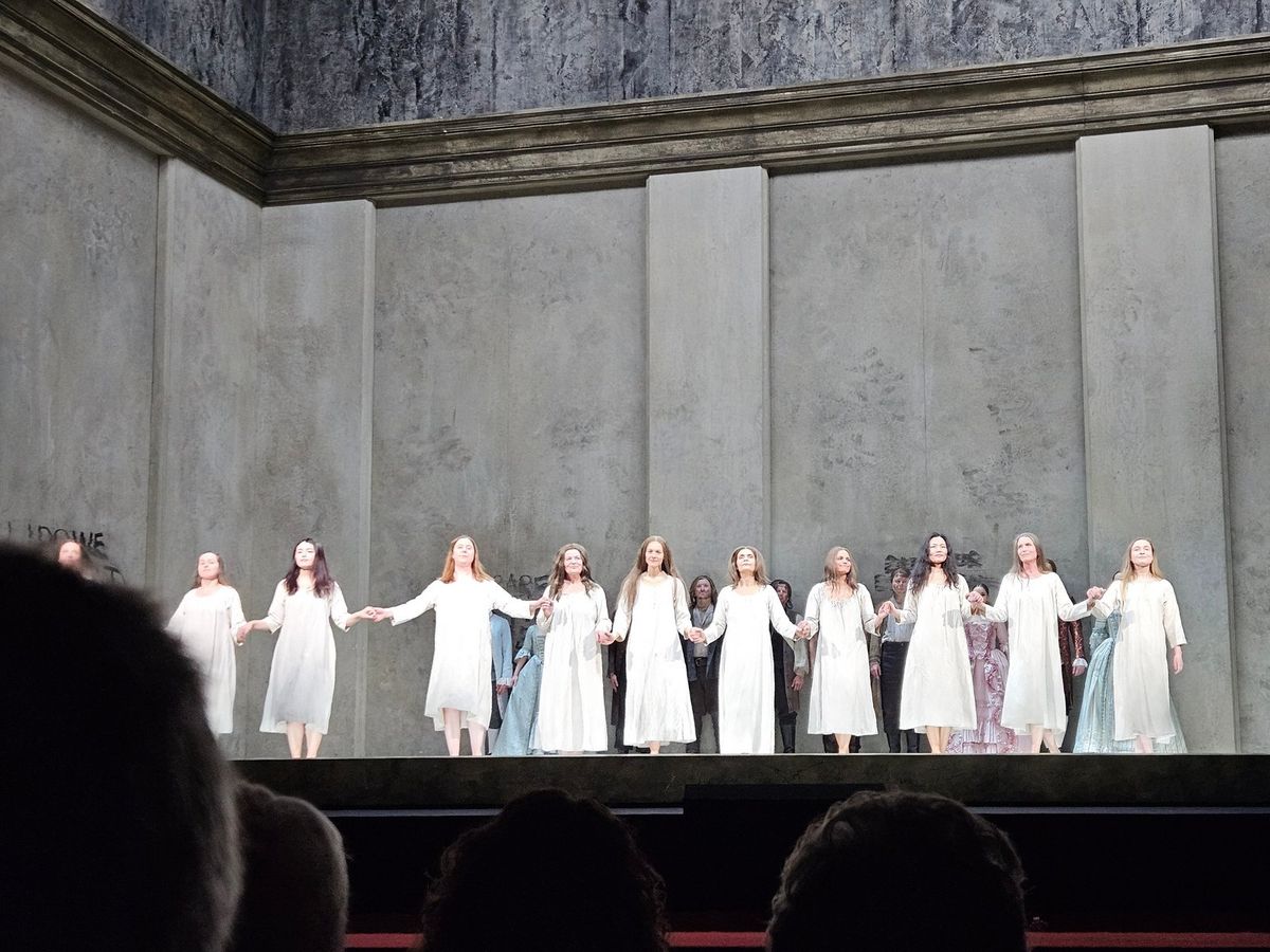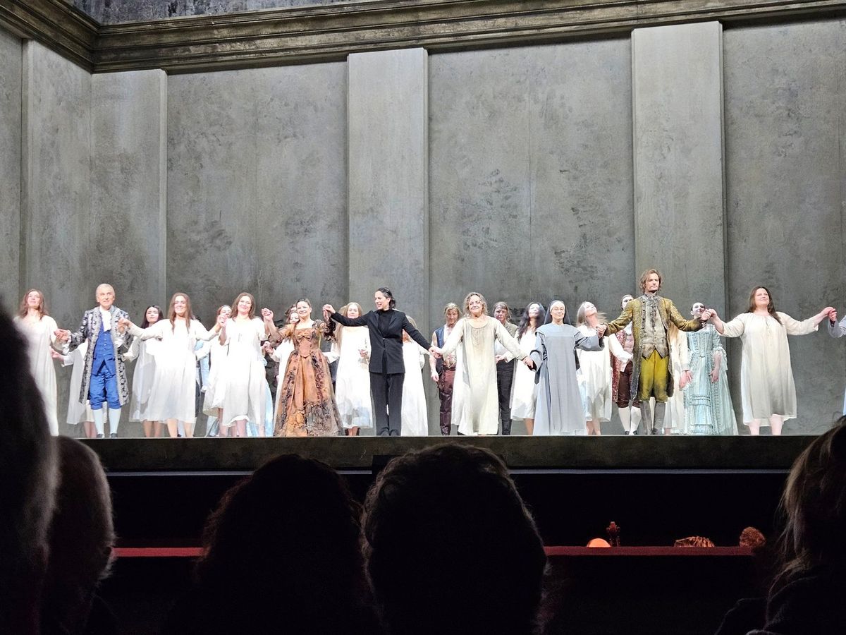 Dialogy karmelitek, Semperova opera, Drážďany, 23. 2. 2026. Karmelitek je ve hře celá řada, větší část tvoří sboristky.