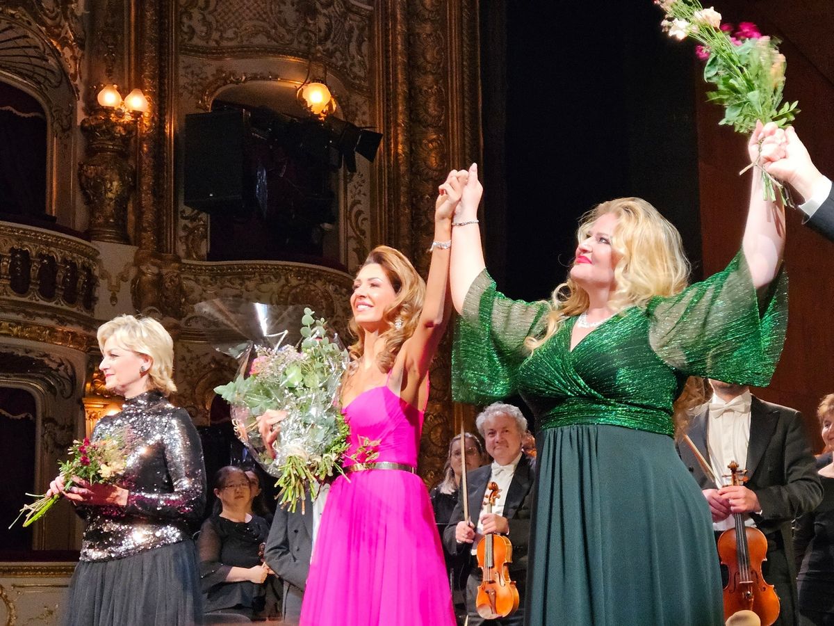 Norma v koncertním provedení, Státní opera, 23. 11. 2025. Zleva: Sylva Čmugrová (Clotilde), Štěpánka Pučálková (Adalgisa) a v hlavní roli Marigona Qerkezi (Norma).