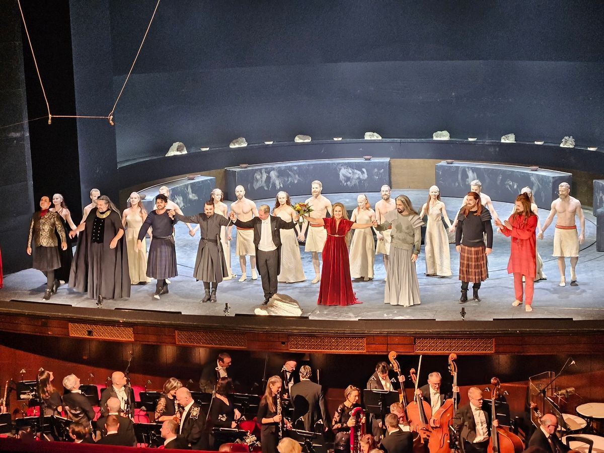 Legenda z Erinu, Národní divadlo, 26. 10. 2025. Zleva první v první řadě: Martinec (role: hlasatel), Zahradníček (Kormak), Berger (Dermat), Brückler (Midak), Jindra (dirigent), Poláčková (Grania), Carico (Finn), Sem (Ossian) a Bařák (Dara)