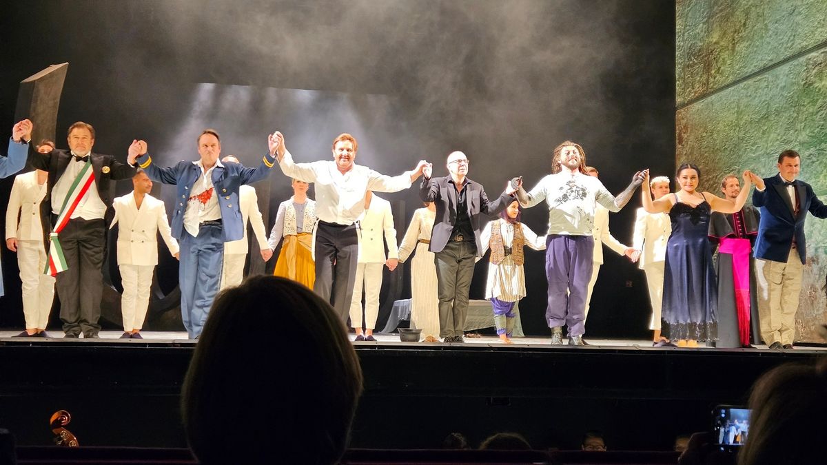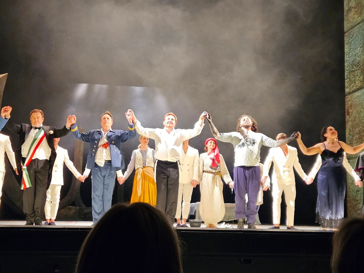 Otello, Státní opera, 20. 11. 2025. Na závěr foto, kde jsou lépe vidět i tanečnice z baletní sboru opery :) Nicméně hlavní účinkující od velvyslance vlevo: Oleg Korotkov (Lodovico), Martin Šrejma (Cassio), Mikołaj Zalasiński (Jago), Denys Pivnickij (Otello) a Olga Busuioc (Desdemona).