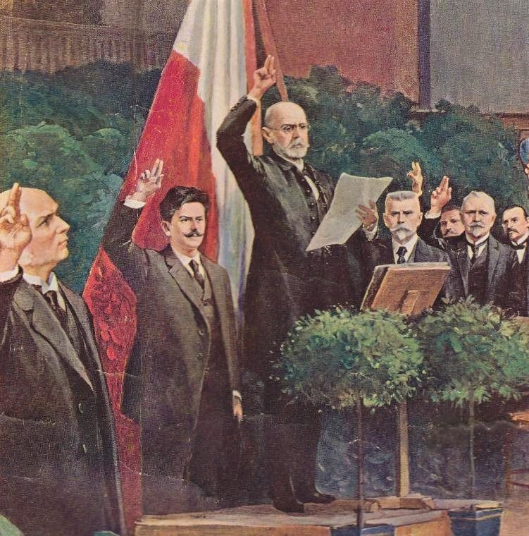 Národní přísaha ve Smetanově síni Obecního domu 14. dubna 1918, zleva v první řadě Antonín Švehla, Jiří Stříbrný, Alois Jirásek, Karel Kramář, František Soukup
