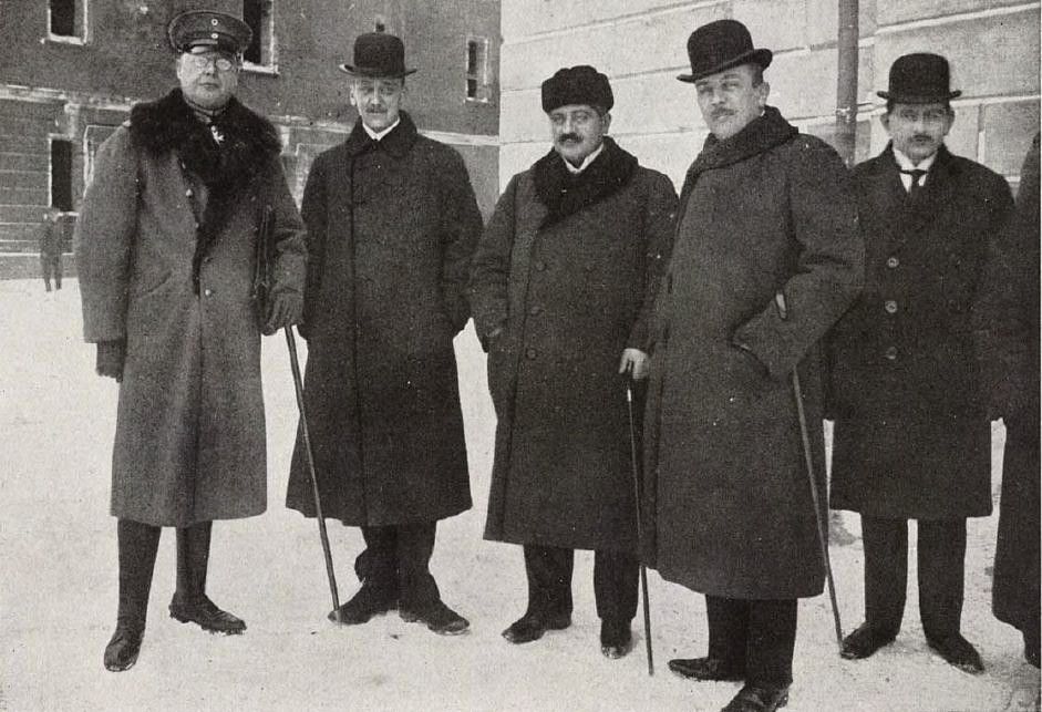 Zástupci Centrálních mocností v Brestu Litevském, hrabě Czernin druhý zleva