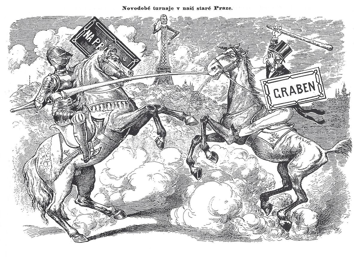 Novodobé turnaje v naší staré Praze, 1894. Antisemitsky pojatá karikatura souboje českého a německo-židovského obyvatelstva o vládu nad městem