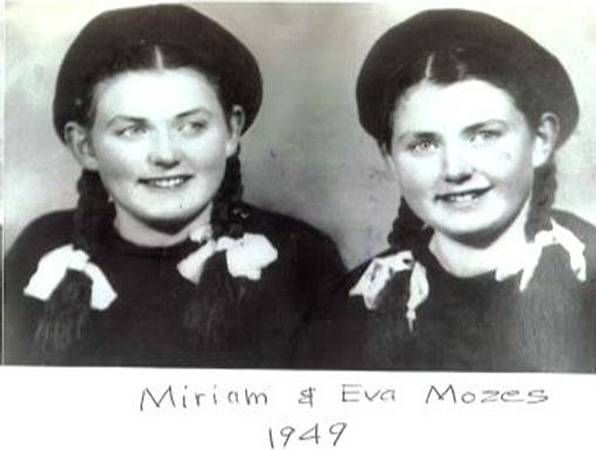 Fotografie zobrazuje Evu a Miriam Mozesovy, jednovaječná dvojčata, která přežila koncentrační tábor Auschwitz-Birkenau a brutální experimenty nacistického lékaře Josefa Mengeleho, včetně testů na dvojčatech během holokaustu. Obě sestry byly po válce osvobozeny Rudou armádou spolu s dalšími přeživšími a staly se významnými svědkyněmi těchto událostí.