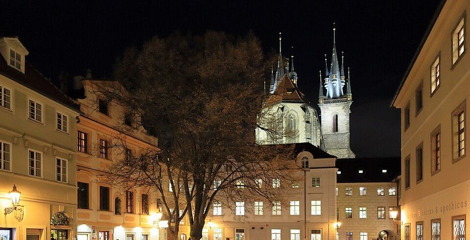 Ungelt za Týnským chrámem, kde se ve středověké Praze soustřeďovali zahraniční obchodníci a díky anonymitě a toku peněz